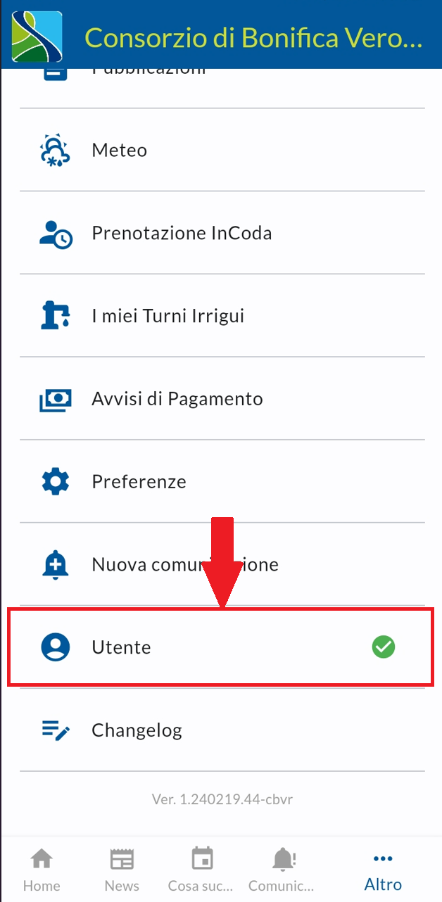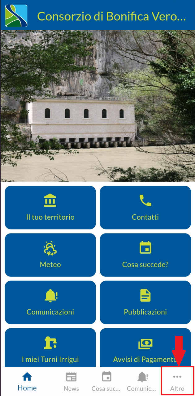 Per cancellare definitivamente il proprio account dal sistema del Consorzio di Bonifica Veronese, accedi all'app e entra nel menu Altro